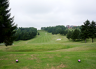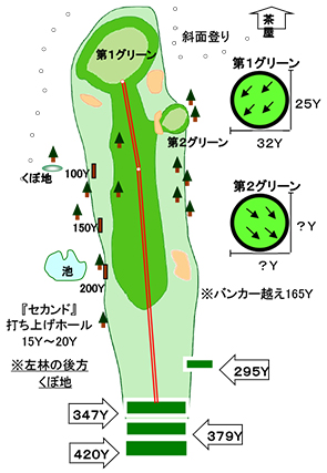 左林の後方はくぼ地なので、ティーショットは中央やや右狙いで。 バンカー越えには165Y。 セカンドショットは15~20Yの打ち上げになります。