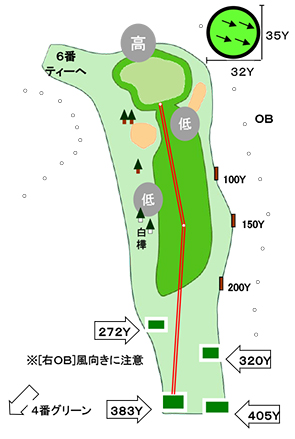 右側にOBあるが、ティーショットはセンターよりやや右が狙い目。