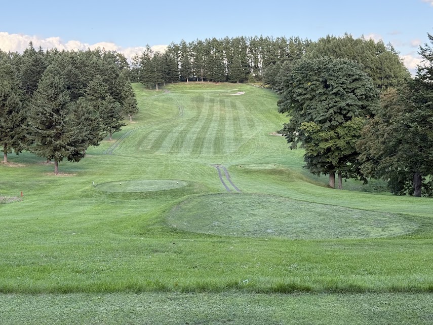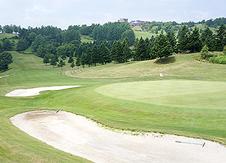 ティーショットを左に曲げて、フチに落ちると池に入りやすいので注意。