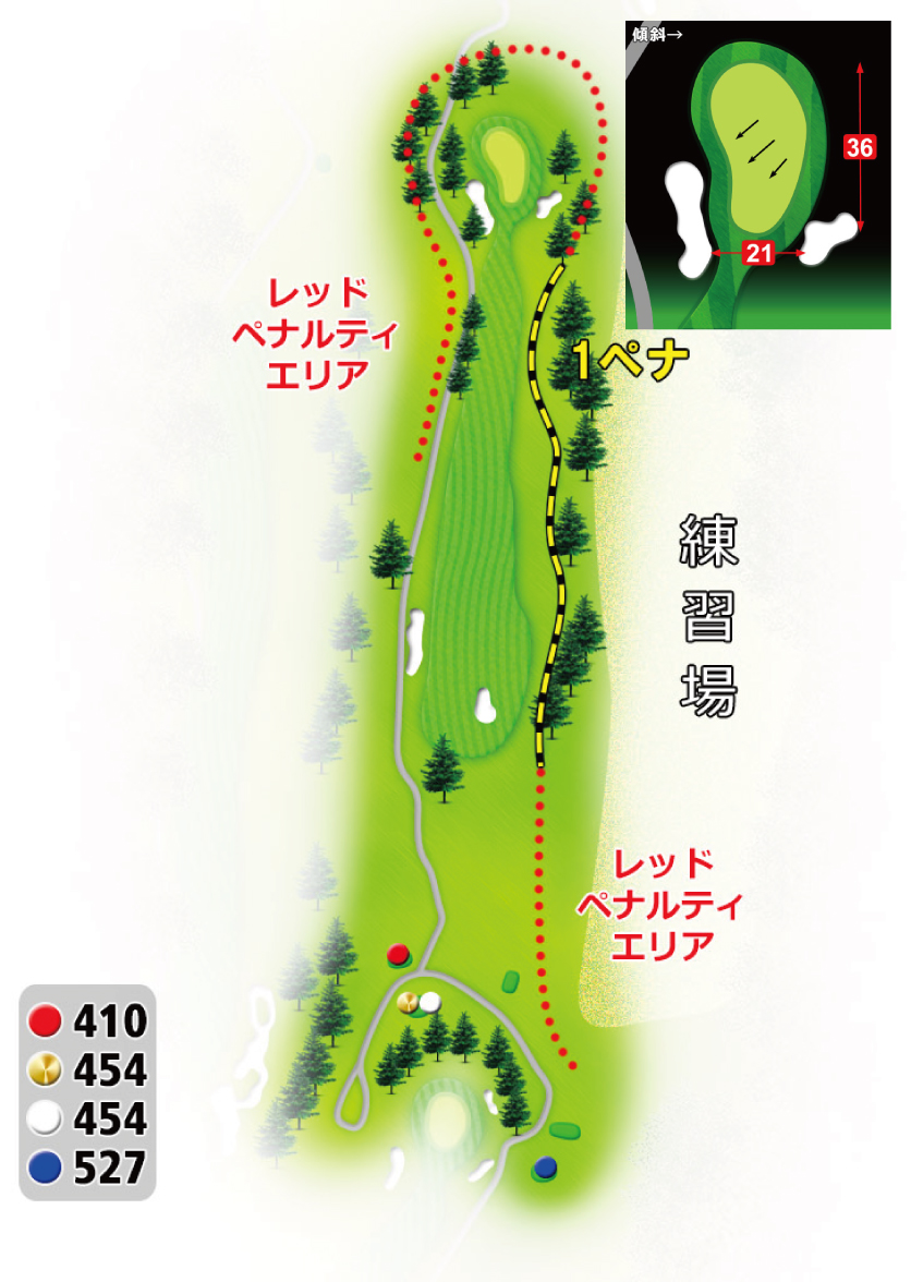 グリーンは2段グリーン。ピン位置で2打目のクラブ選択が重要。