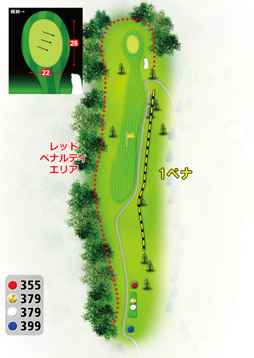 右側はトラ杭でワンペナとなる為、センターよりやや左狙い。 2打目は打ち下ろしグリーンを狙うかたちになる。グリーン奥はラフが深いためクラブ選択は慎重に。