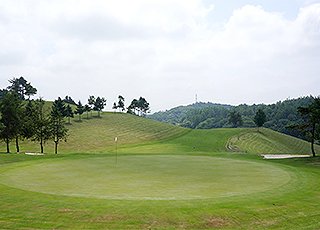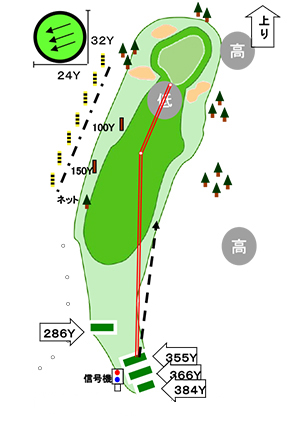 ブラインドのため、信号が青になってからティーショットを打って下さい。 (前の組が2打目を打ち終えてから) ティーショットは山裾と松の間狙いで。