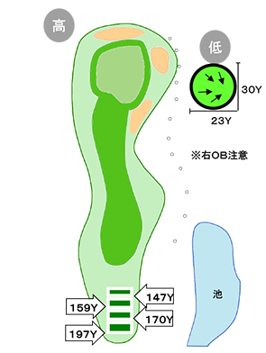 ティーショットはグリーンエッジまで-15Yで計算。 右OB注意、左手前から攻めるとオンの確率が高い。 風向きに注意。