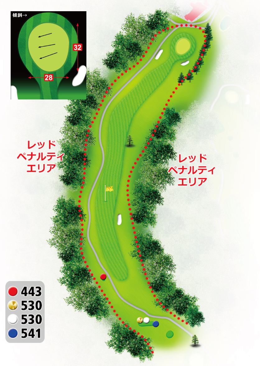 ティーショットが真っ直ぐいくと右側に落ちる可能性が有り、確実にフェアウェイをキープしたい。